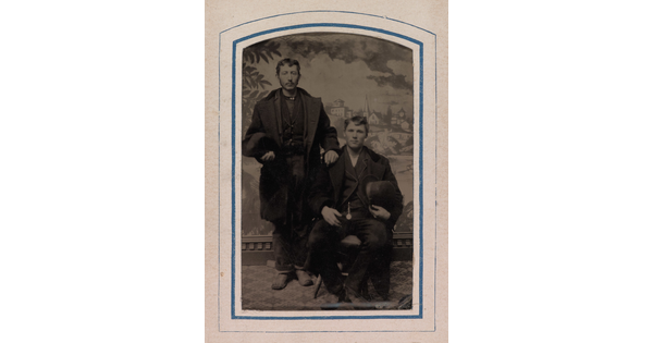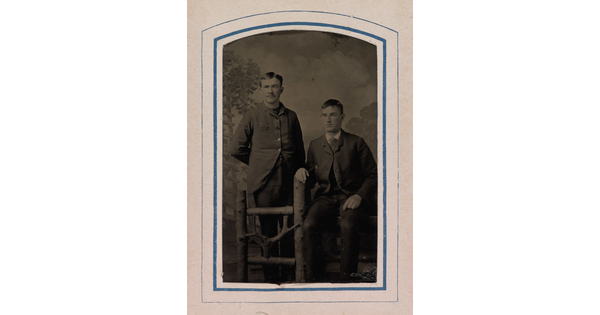 • [Two young men by (studio) log fence]