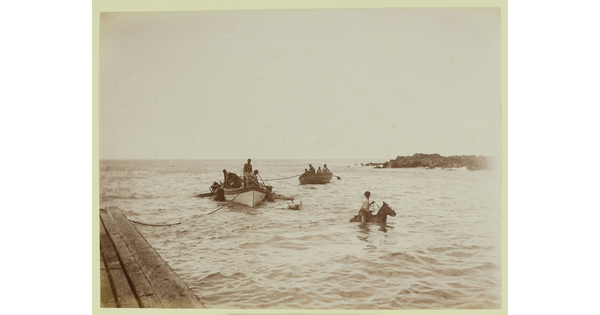 www.cartermuseum.org/.../two-small-boats-men-and-one-horseback-leading-cattle-through-water-p19758948
