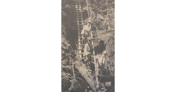 • [Two women and one man descending staircase]