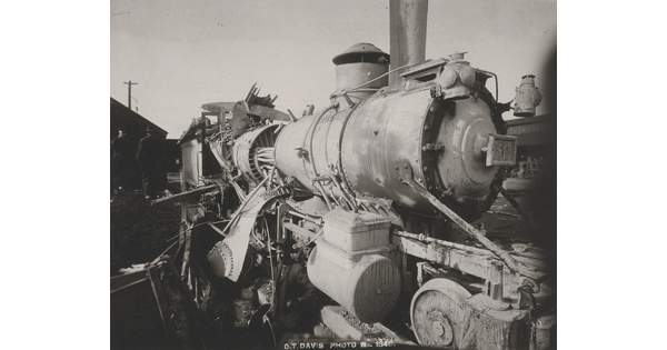 • [Front detail of wrecked train engine]