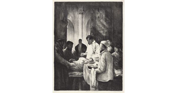 • A black-and-white sketch-like print of soldiers, some dead, lying in a trench as soldiers above crouch and point.