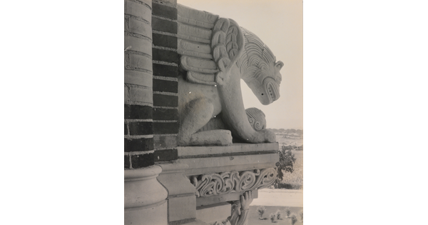 • A black-and-white photograph of a terraced adobe bell tower with a cross on top, partially hidden by a terraced adobe wall.