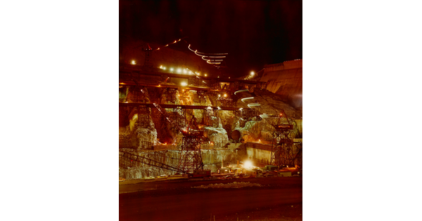 • [Night construction activity on the Grand Coulee Third Powerplant and Forebay Dam]