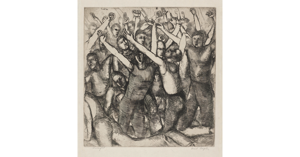 • A brightly-colored print of a nicely dressed Black family walking past men doing construction on a city street.