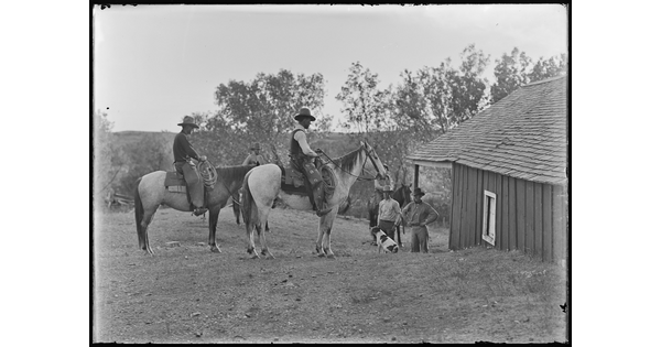 Cowboys arriving at a ranching line camp. Line camps were maintained along the range borders at a considerable distance apart, and used periodically for fence building work or some special job. Blanco Canyon, Texas.