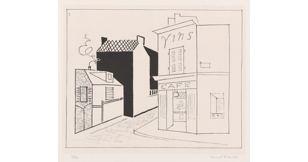 • A black-and-white print of a cityscape featuring several buildings seen from a street.