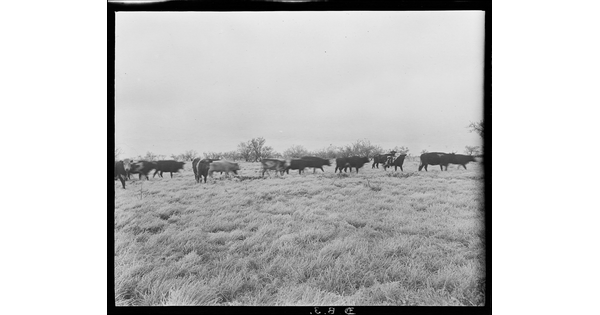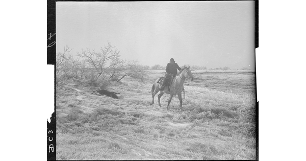 Edwin Sanders dragging a beef in for butchering in bitterly cold weather; this type of storm is usually referred to as a "blue norther." ED Ranch, near Crowell, Texas.