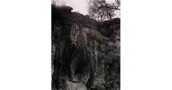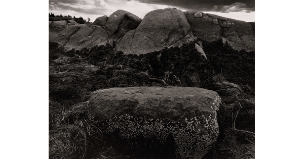 • A sepia-toned photograph of two gravestones surrounded by large rocks.