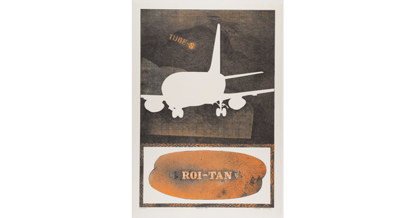 • A black-and-white photograph of a rural road lined with billboards and powerlines, and a rollercoaster in the distance.