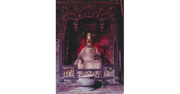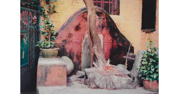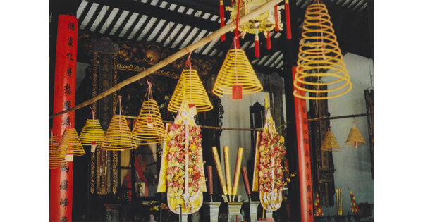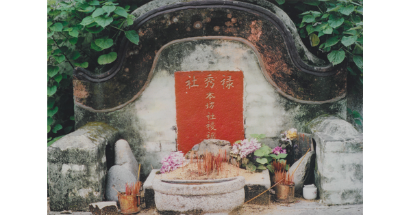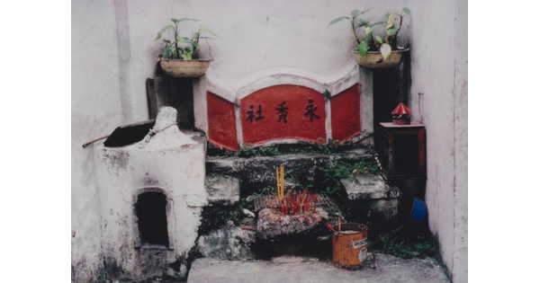 • A color photograph of a stone altar with a red border above it and several incense sticks in various small vessels.