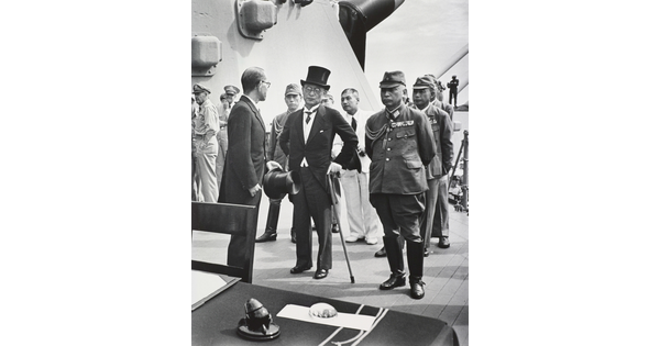 • Mamoru Shigemitsu and General Yoshijiro Umezu Stand Ready To Sign the Surrender on the Deck of the USS Missouri 1945