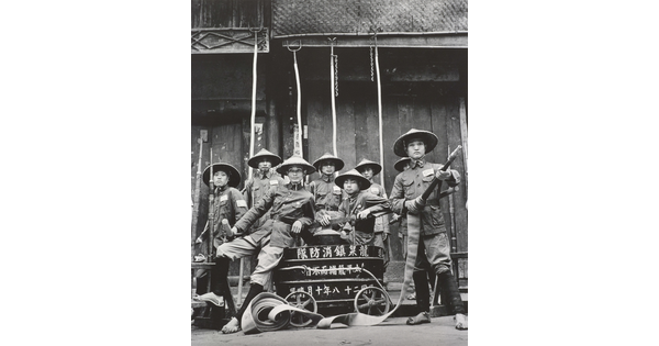 • Volunteer Fire Brigade of Lung Chuan-i Village Poses with Their Water Pump. 1941