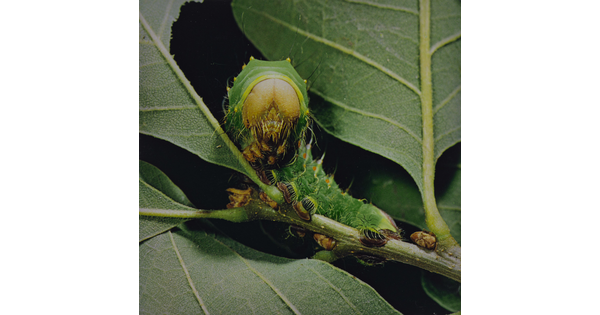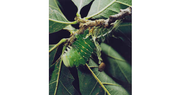 • Telea polyphemus Larva Resting, About 5 Weeks Old, Tesuque, New Mexico, August 1960