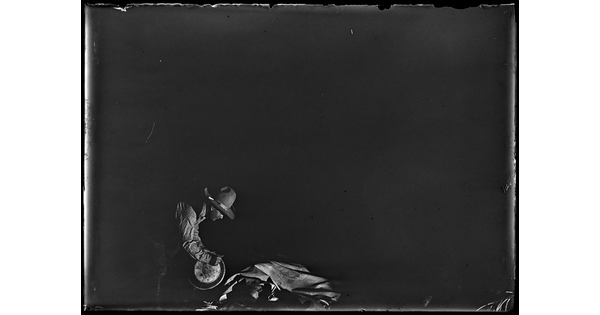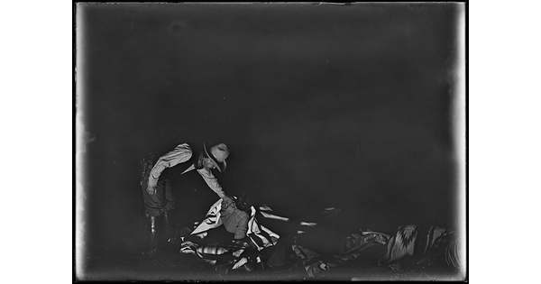 "Waking a night rider." This duty of the early day cowpuncher, like many others, went out of practice with the coming of the barbed wire and the closing of the free range. Before then, each man took his turn at holding the herd. [The "sleeping" cowboy is