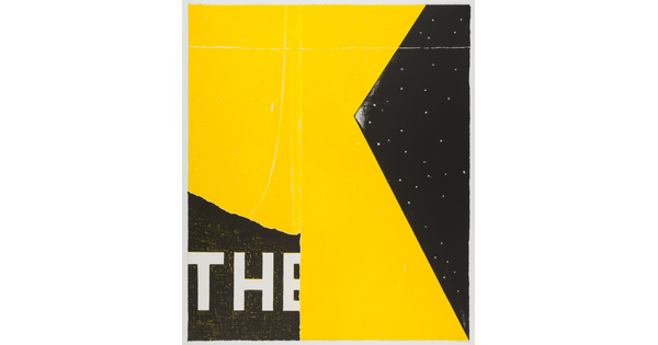 • An abstract color print of a partially-obscured human-like figure in orange and white upside down and diagonal.