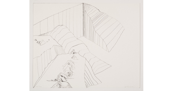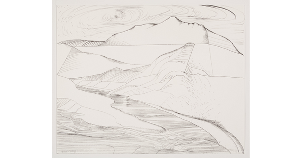 • An abstract black-and-white print of a mountain landscape made up of lines and geometric shapes.