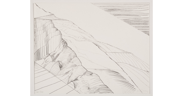 • An abstract black-and-white print of a plain leading to a mountain landscape made up of lines and geometric shapes.