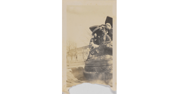 • [Boy and dog sitting on statue]