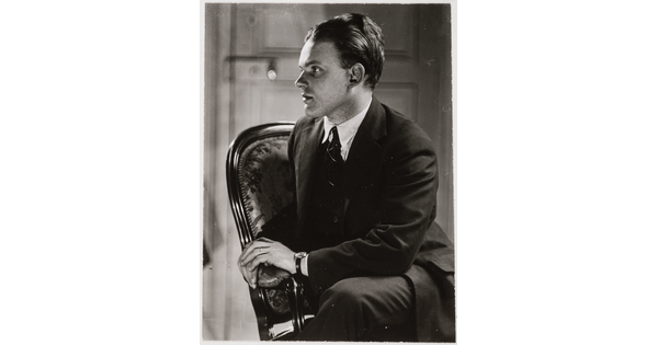 • A black-and-white portrait photograph of a White man in a suit sitting in a chair and gazing directly at the camera with his hands folded in his lap.