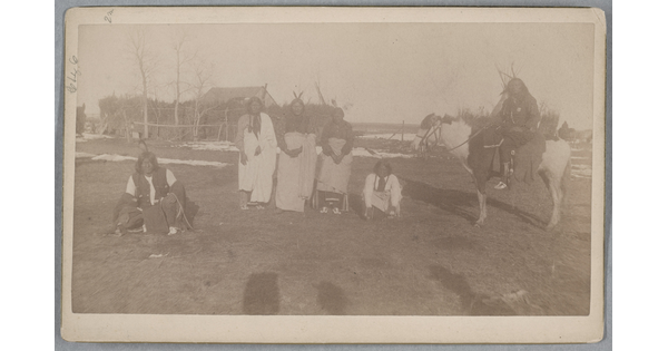 • Black Coyote, Native Policeman; Five Men Nearby Partial Native Dress near Windscreen Around House