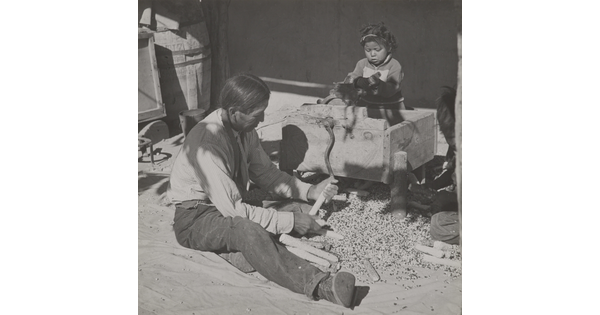 • [Santa Clara Pueblo man and child removing corn kernels from cob]