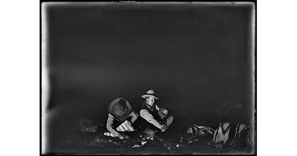 A night herder turning in for a few hours sleep while another sleepy cowpuncher takes turn on night duty. [George Patullo is on the left.] Three Block Ranch, New Mexico.