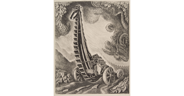• A sepia-toned print of a farmer working in a field, a farm and house surrounded by mountains, streams, and railways.