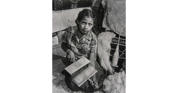 • A black-and-white print of a young woman sitting in a chair with her back mostly to the viewer, while sewing something in her lap.