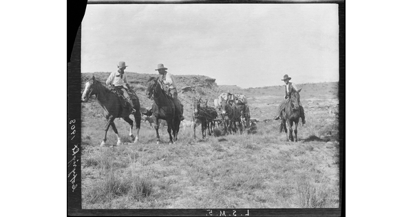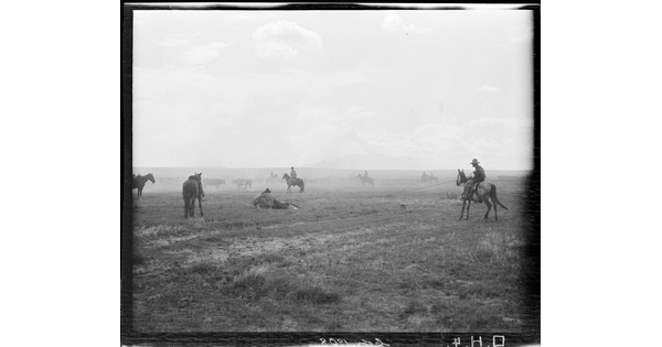 Block cowpunchers "stretching" a large animal for branding or doctoring, two ropes are used only when the animal is hard to manage. Three Block Ranch, near Richardson, New Mexico.
