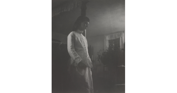 • [Young woman by four-poster bed in white dress]