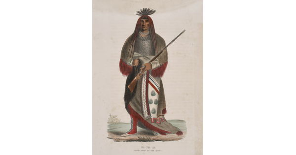 • A color print of a Native American man in two outfits: on the left he wears traditional clothing and on the right a soldier's blue uniform.