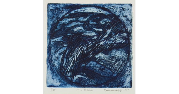 • An abstract color print of a clothed figure lying down, reaching up toward a nude horizontal figure floating above it.