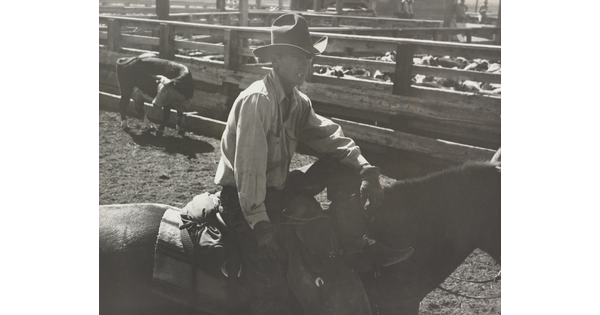 • A black-and-white photograph of a White man in a cowboy hat sitting astride a dappled horse.