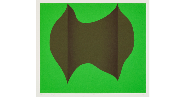 • An abstract color print of a green triangular splotchy form beneath green handwritten text that reads, "The dream of love & death."