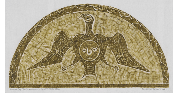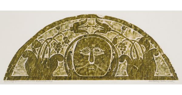 • A monochromatic print of a tomb rubbing of a stylized face with swirls emerging from their head, all within a semi-circle.