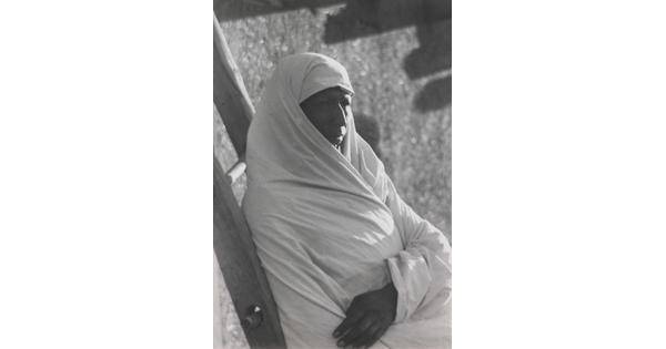 • A black-and-white photograph of a person wearing a long shawl over their head and torso while walking through the wood gate of an adobe building.
