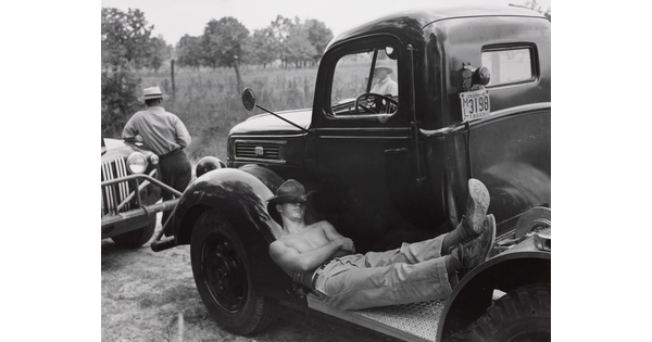 • Member of Shooting Crew Takes a Nap on the Reel Truck during Lunch Time. Seismograph Party 17, Vicinity of Huntsville, Texas