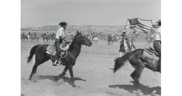 • A black-and-white photograph of a group of spectators watching cowboys and horses in an outdoor arena.