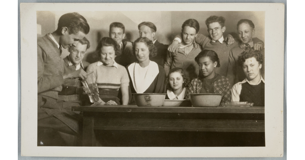 • A black-and-white photograph of White women and children wearing long dresses holding hands to form a circle in a grassy field.