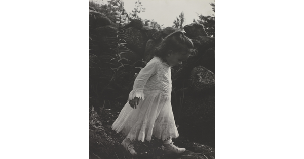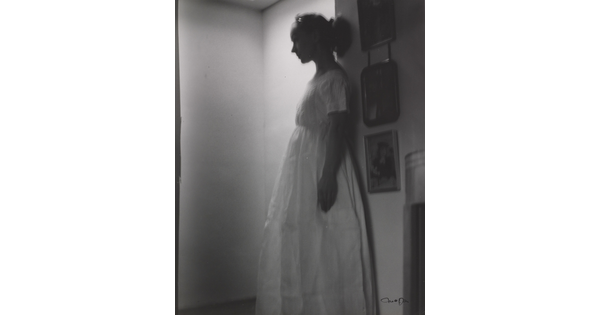 • A black-and-white photograph of a White woman wearing a flowing white dress and looking down as she stands in a field.