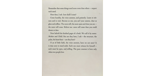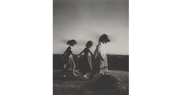 • A black-and-white photograph of a woman, seen from the back, and two White children holding hands in a grassy field.