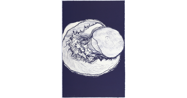 • An abstract black-and-white print of plant-like shapes stretching and bending over chunky, black shapes.