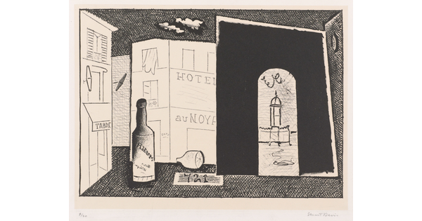 • A black-and-white print of a simply-drawn corner hotel façade, with the words "hotel" and "cafe" written above the entry.