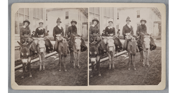 • [Four ladies seated on burros, Green Lake, Colorado]