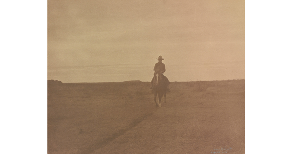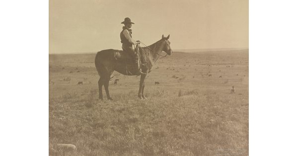 • Henry Lyman, range boss of the LS, on his pony, A.P. Bar, looking across the Panhandle country