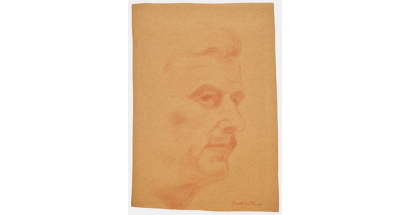 • A black-and-white print of a sketch of a White man from the waist up with a full beard and mustache crossing his arms in front of him.