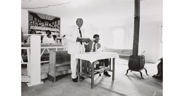 • A black-and-white photograph of a Black man in a white tuxedo toasting with a Black woman in a formal dress as another woman watches.