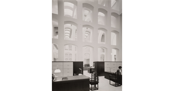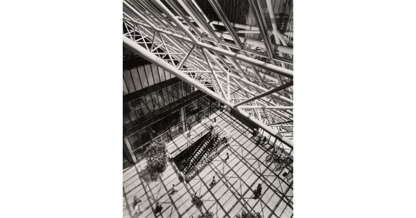 • A black-and-white photograph of a cafeteria under a ceiling of windows that look up to a city skyline.