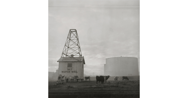 • North Tank Farm. Cattle Are Herded on the Tank Farm to Keep the Grass under Control. The Water Well Supplies Water for the Refinery and the Cattle. Humble Oil and Refining Co., Baytown, Texas