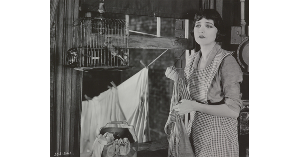 • [Agnes Ayres in apron, hanging laundry on clothesline, "Forbidden Fruit"]
